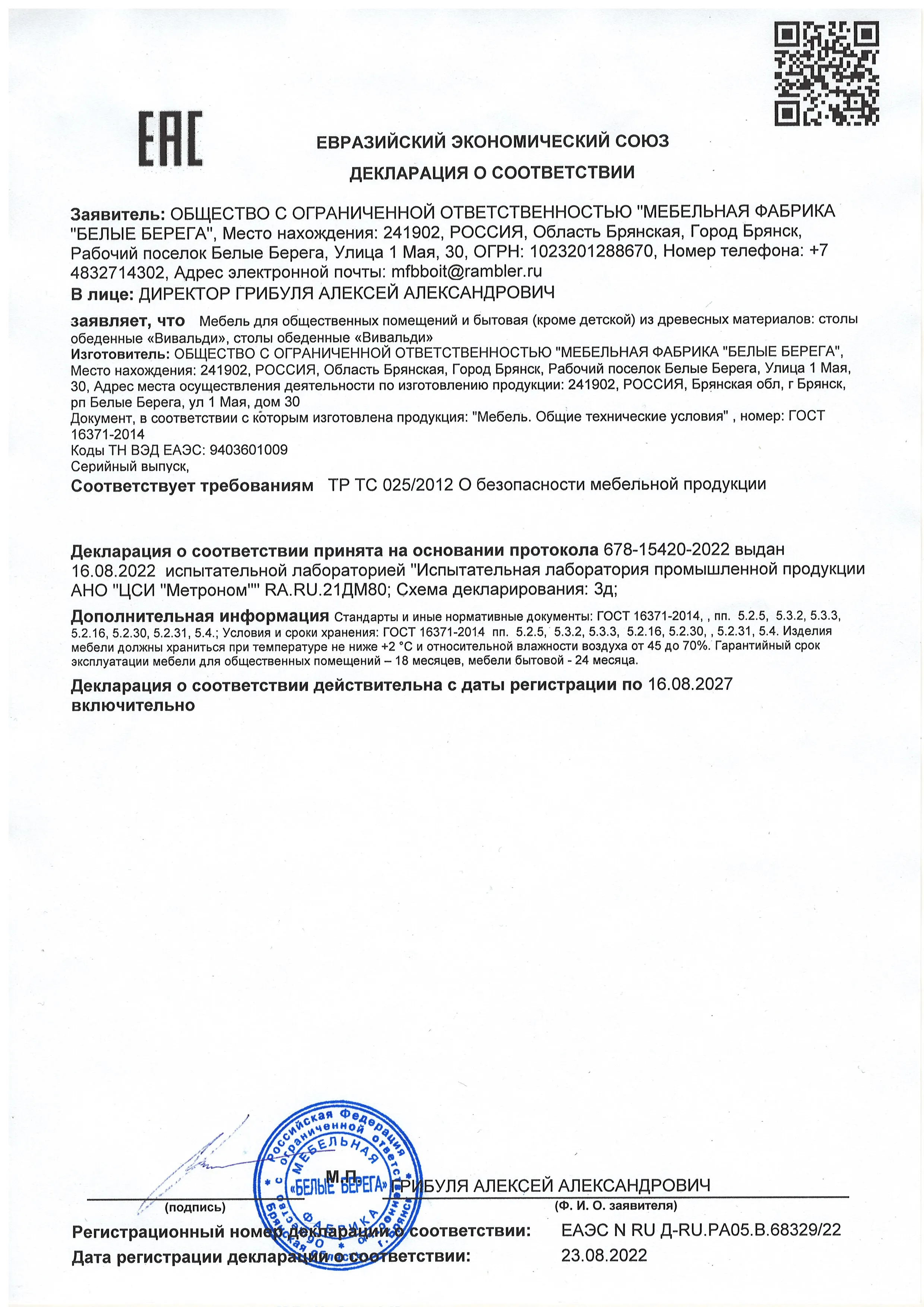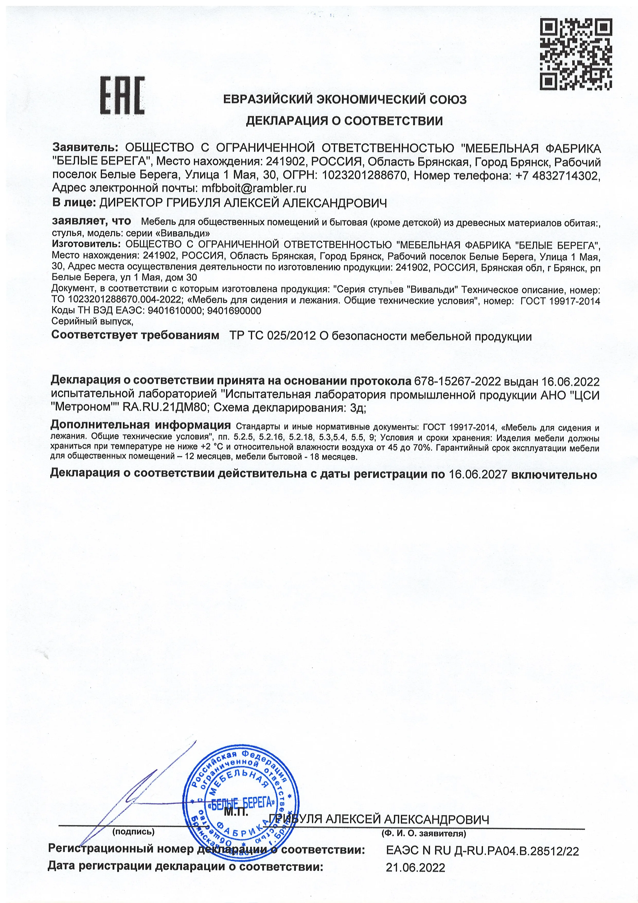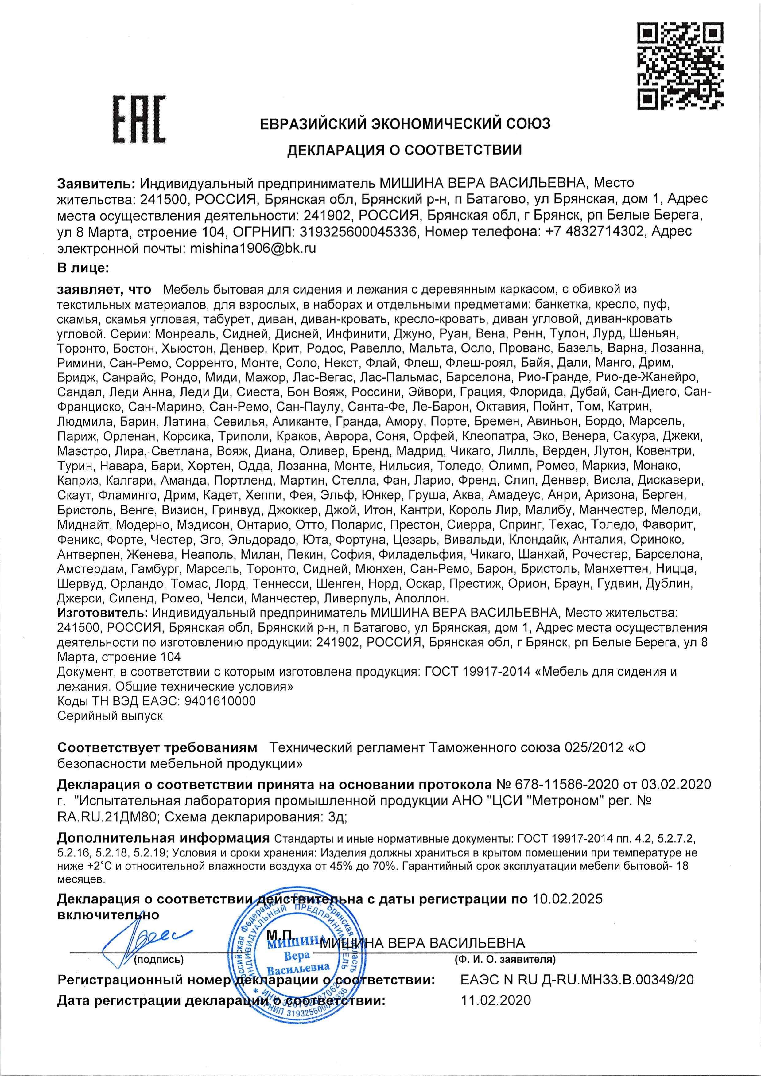 Декларация мебель для сидения и лежания 10-02-2025