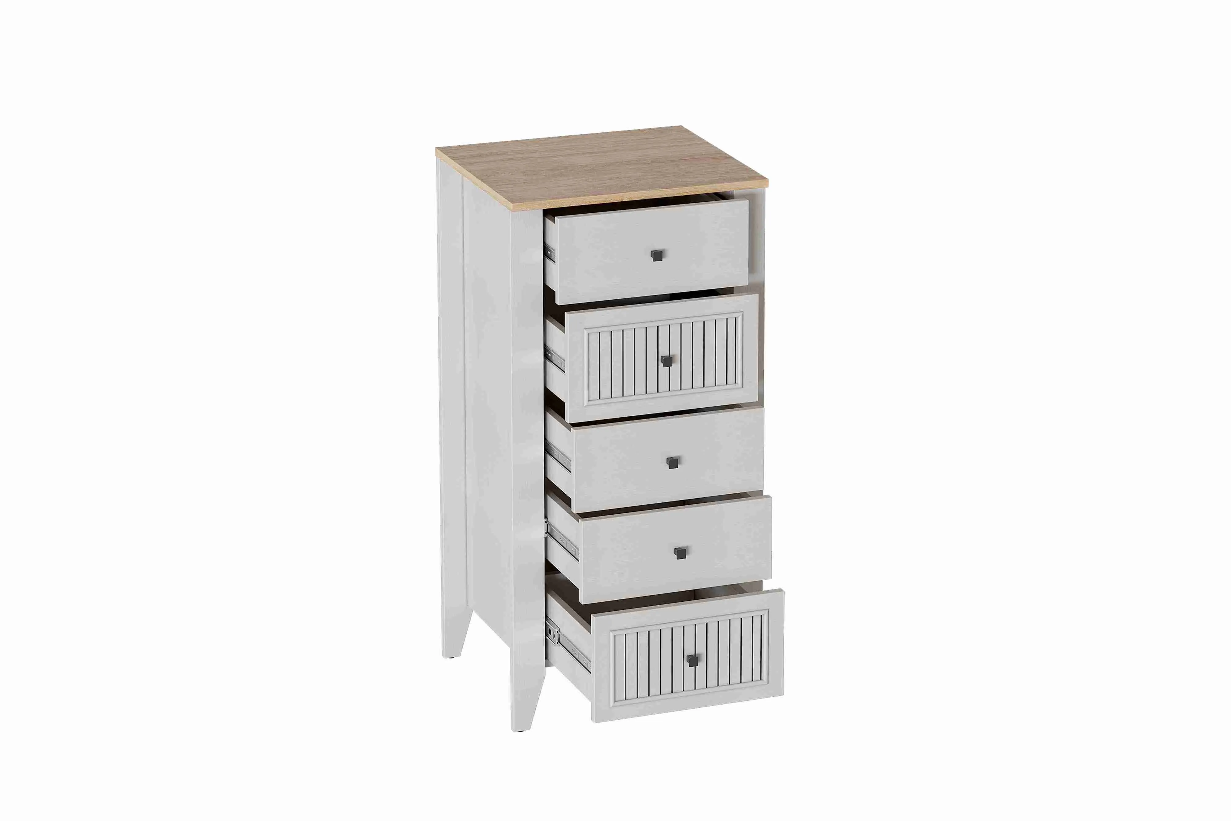 Комод с 5 ящиками Валенсия выполнен из (ЛДСП) в комбинации Дуб натуральный светлый / Персидский жемчуг.