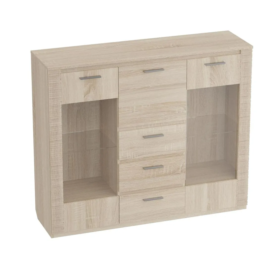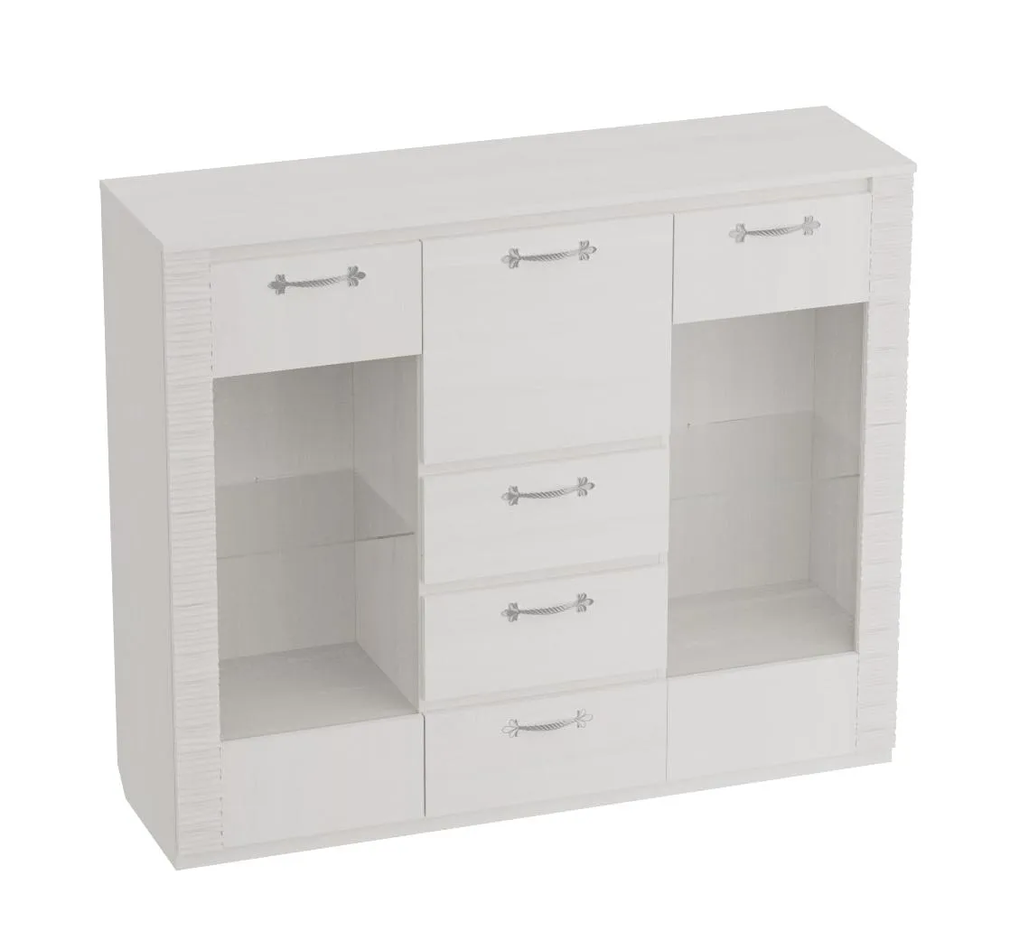 По центру комода располагаются три ящика на роликовых направляющих, над которыми имеется отделение бара закрытое глухой дверцей. Боковые отделения закрыты распашными дверцами со стеклом. Каждое из отделений оснащено двумя стационарными полками и съёмной стеклянной полкой, на которую можно установить светильник.