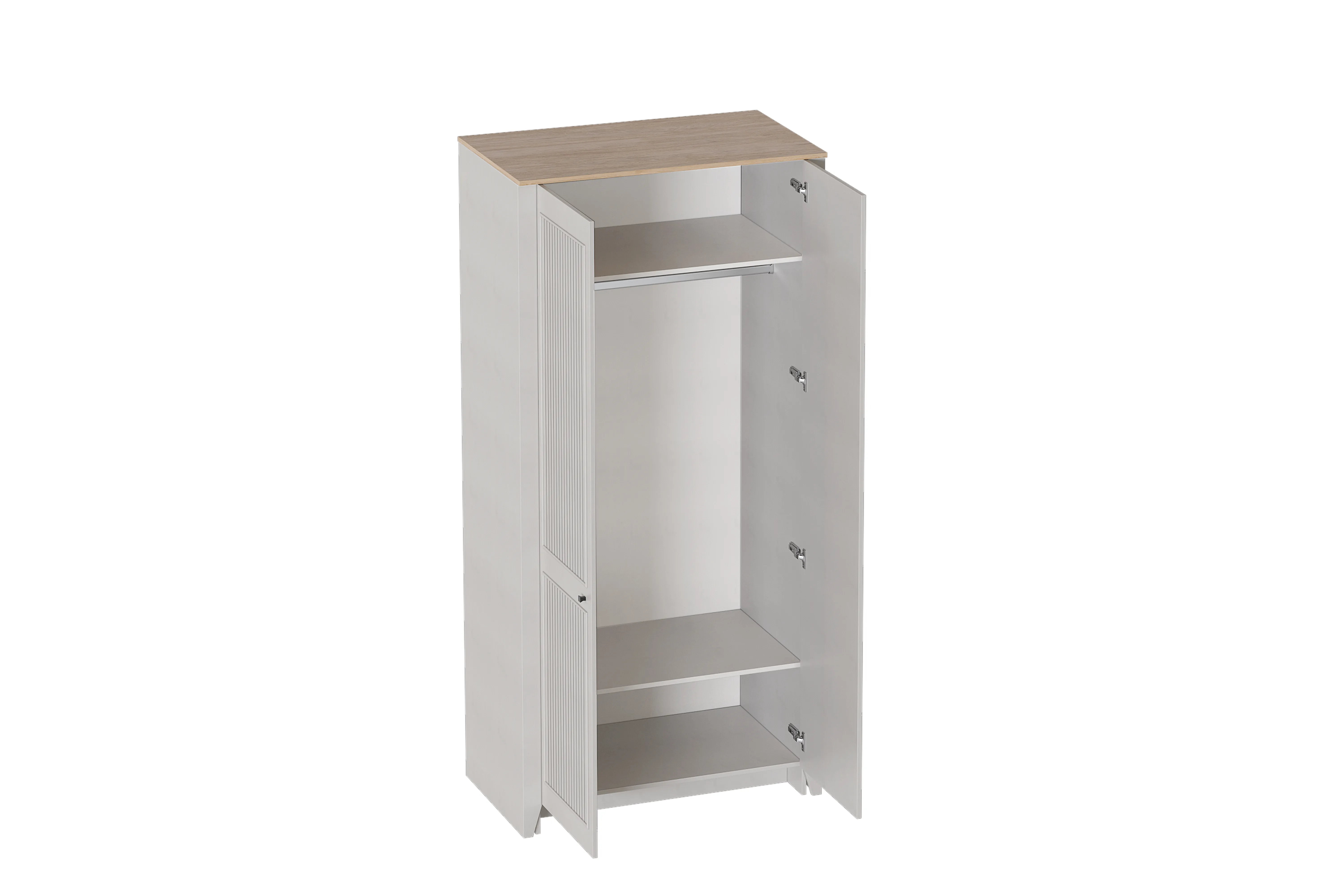 УФ-фотопечать полосок на фасадах в обрамлении пластиковых молдингов придает изделию оригинальный стиль современной классики. В центральной части шкафа расположена штанга для одежды, а также верхняя и нижняя полки. Задняя стенка шкафа изготовлена из ХДФ. На опорах размещены войлочные подпятники.