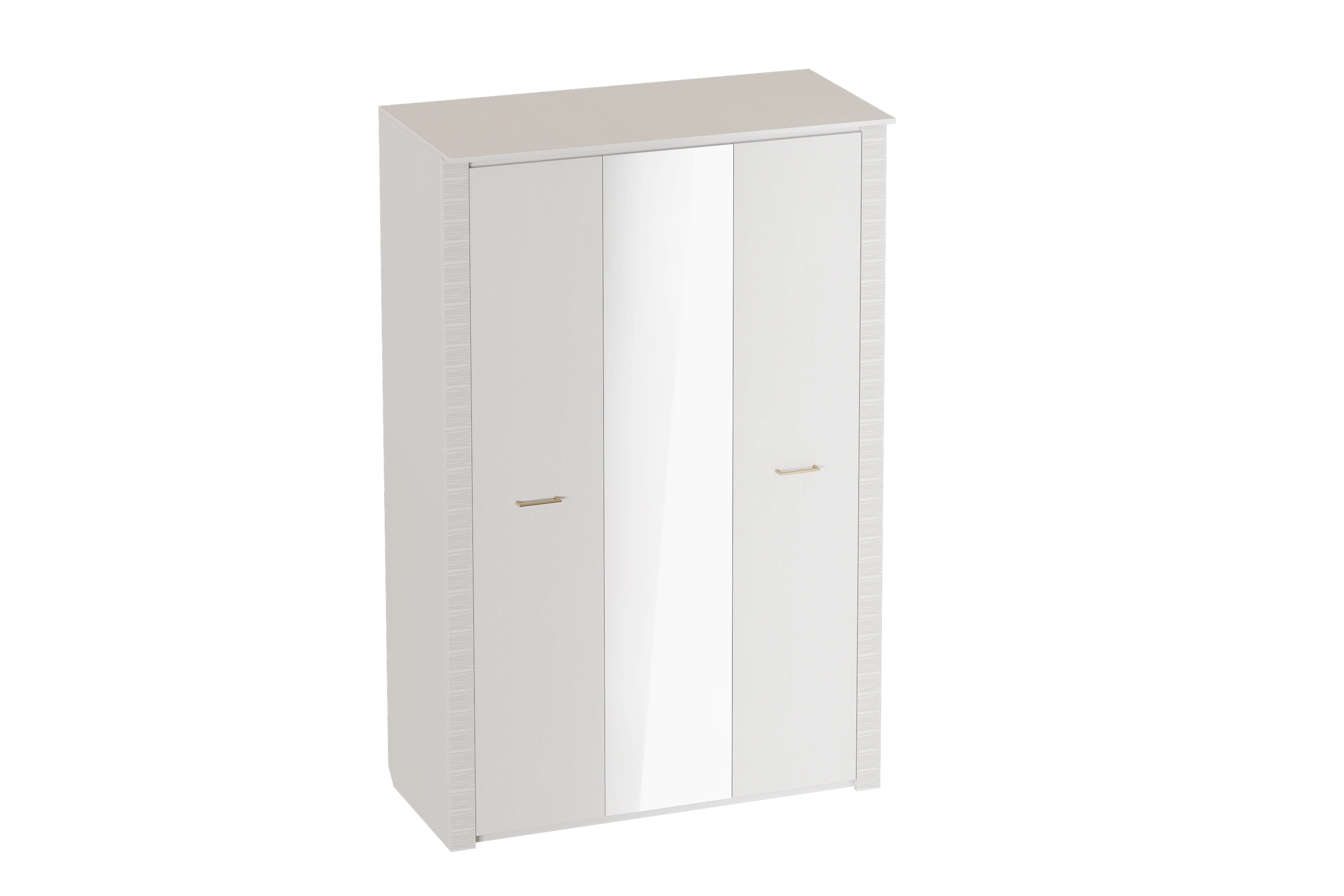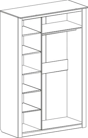Трехдверный шкаф с зеркалом "Элана" оснащен двумя отделениями: для белья с четырьмя съёмными и центральной жёсткой полкой; платяное с жесткой полкой и продольной стальной штангой. В колпаке шкафа имеются пазы для двух светильников, входящих в комплект. Блок питания приобретается отдельно, и рассчитан на подключение шести светильников.