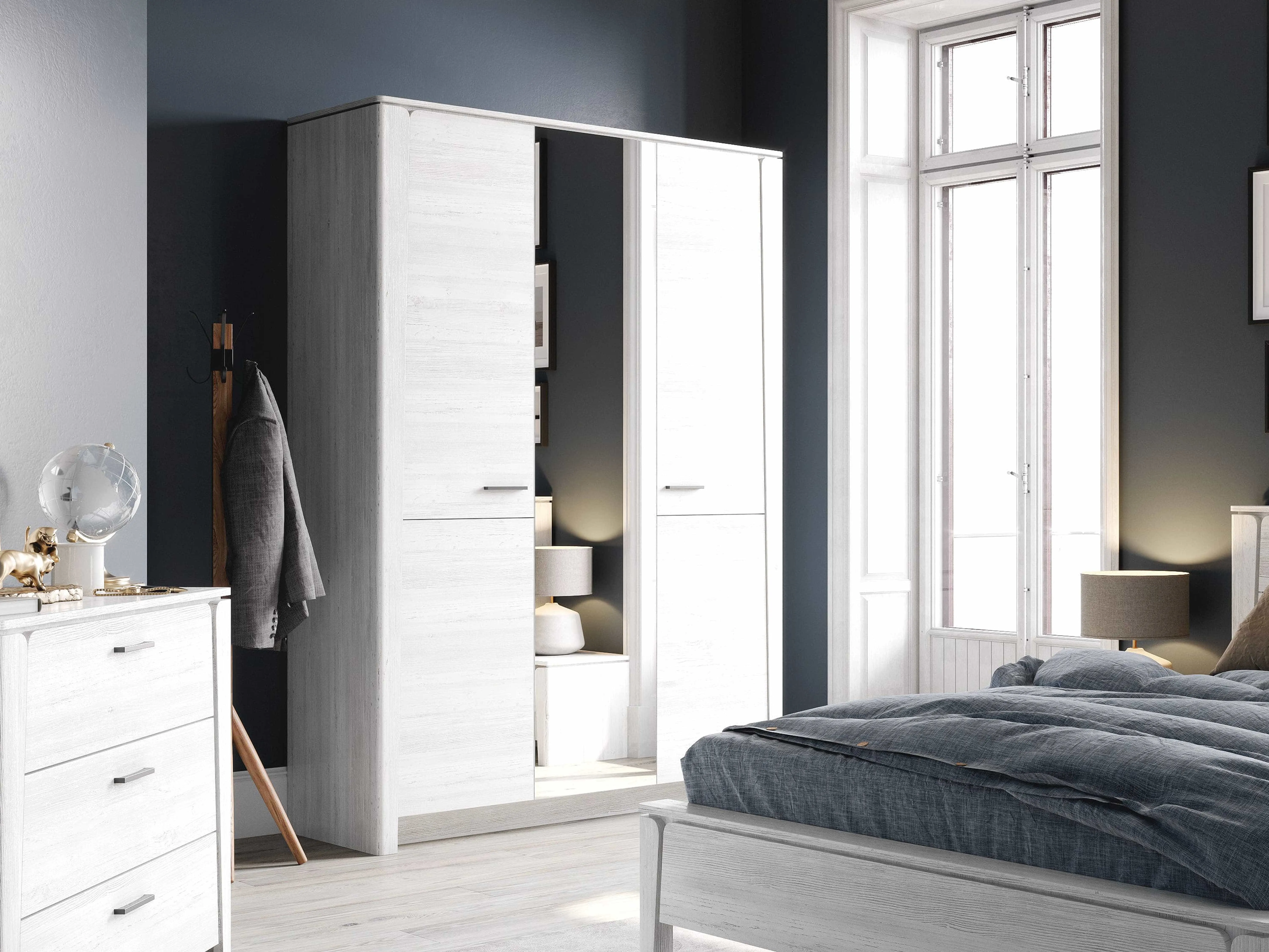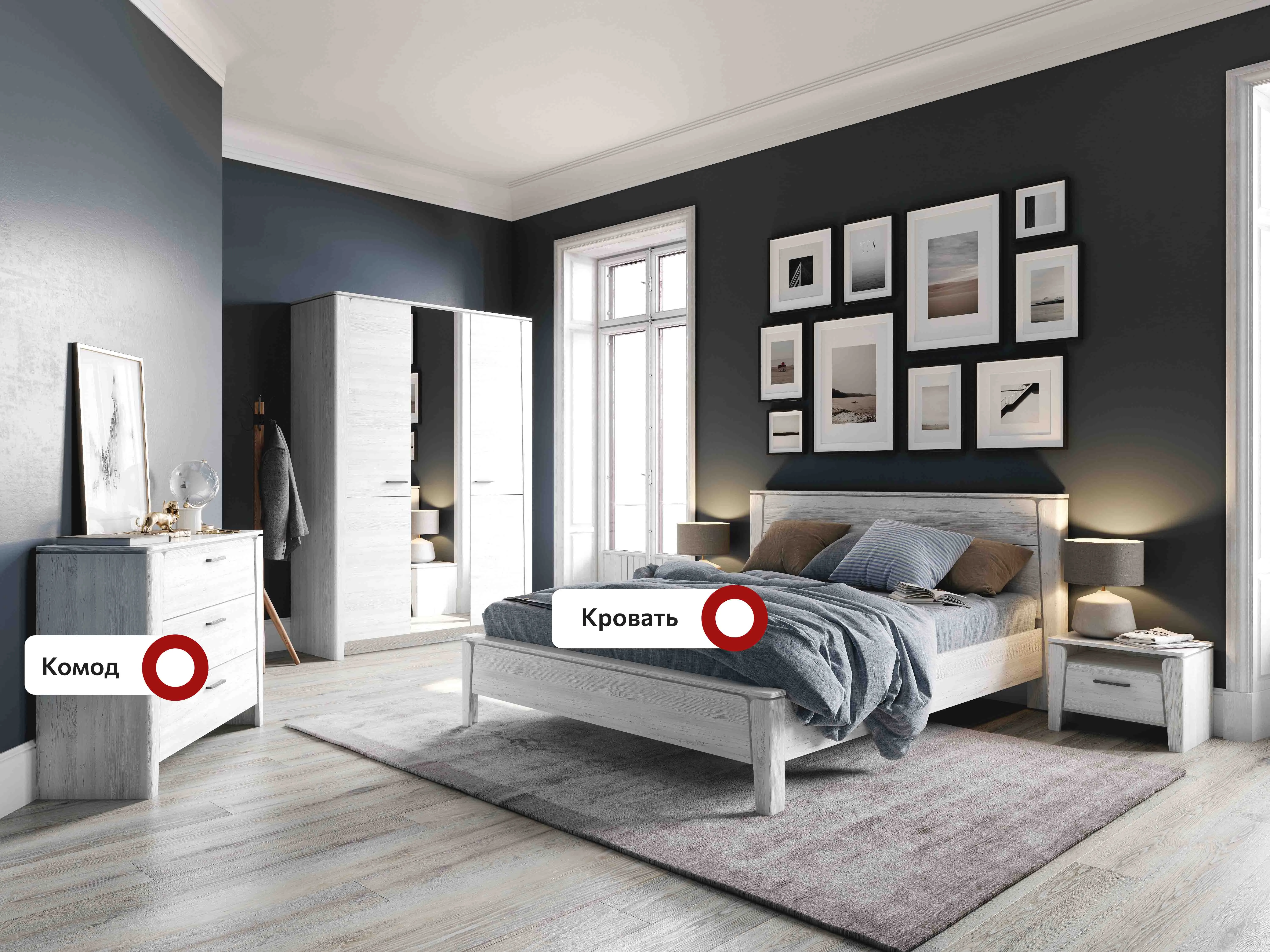 В состав гарнитура входят различные элементы, которые позволят вам создать уютную спальню, такие как: шкаф двухдверный, шкаф трёхдверный, туалетный столик, комод с тремя ящиками, тумба с ящиком, кровать.