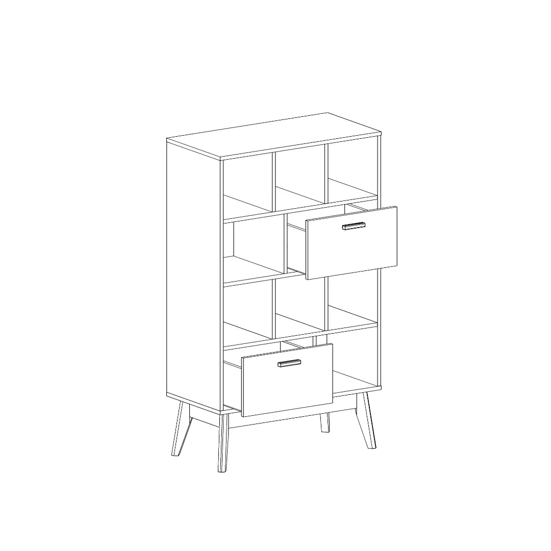 Корпус стеллажа выполнен из ЛДСП цвета натурального дерева, высокие стильные опоры и ручки - из массива березы. Стеллаж прекрасно сочетается с шкафом-витриной Калгари и ТВ тумбой. Прекрасно будет смотреться как в гостиной, так и в детской комнате или спальне.