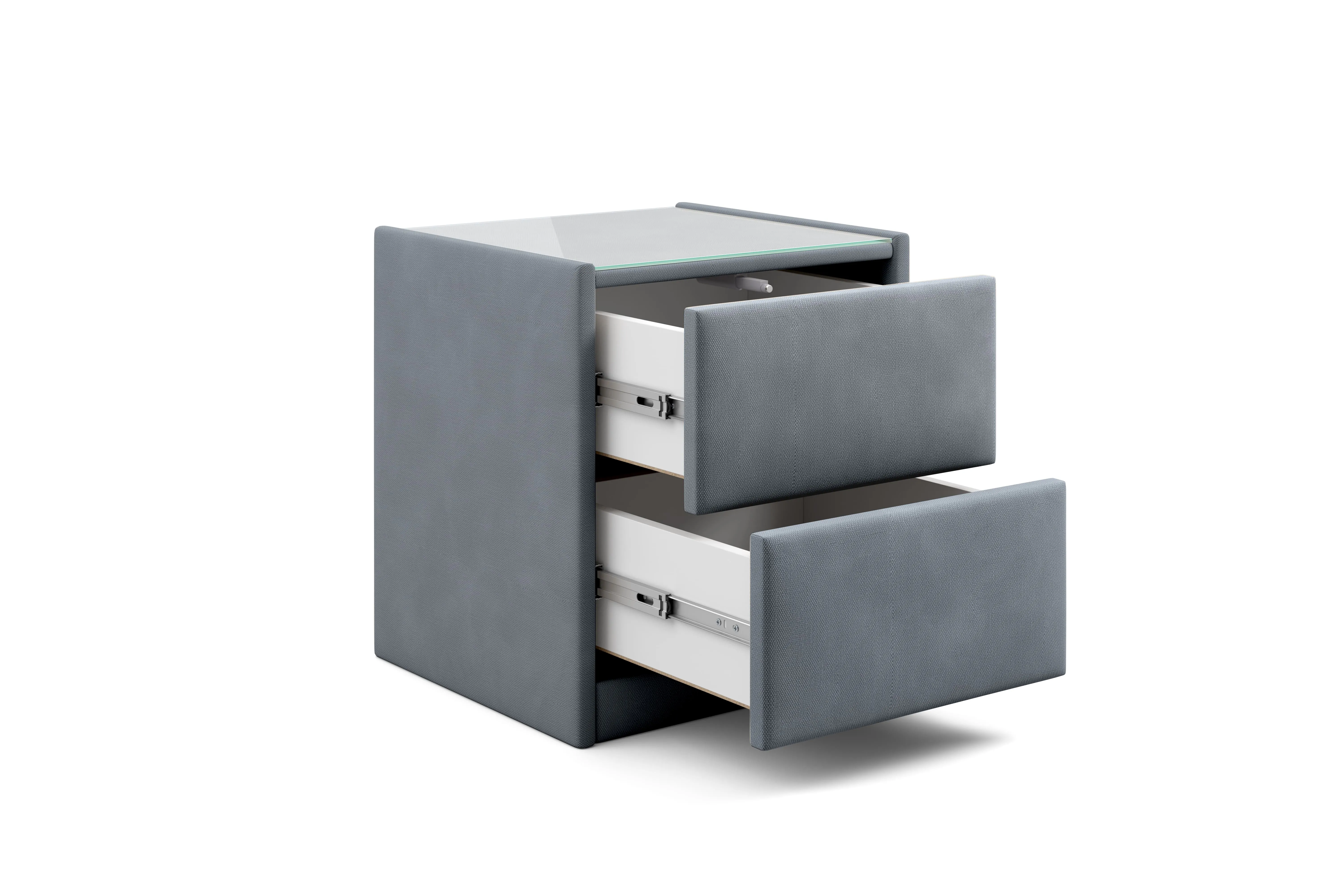 Тумба обтянута высококачественным велюром, что придает ей особый уют и комфорт. Имеет стеклянную столешницу и два вместительных выдвижных ящика с механизмом Push to open. Скругленные торцы модели, минимизируют риск удариться в темноте.